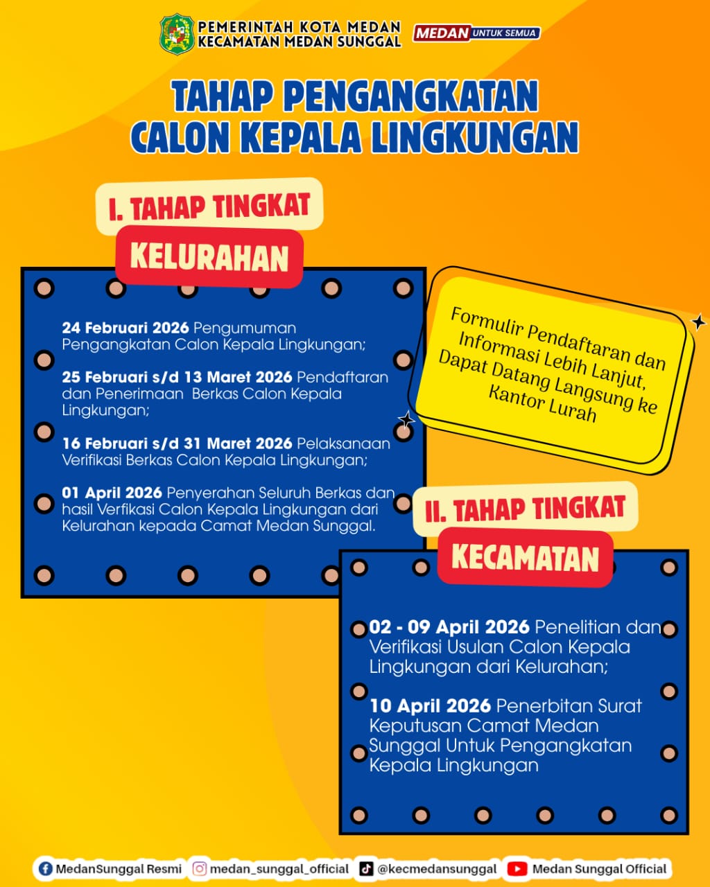 Info lebih lanjut & pendaftaran : datang langsung ke Kantor Kelurahan Simpang Tanjung (JL. Balai Desa No. 2, Kelurahan Simpang Tanjung, Kecamatan Medan Sunggal)